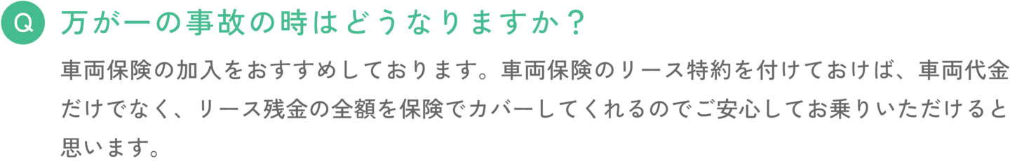 車両保険の加入をおすすめしております。車両保険のリース特約を付けておけば、車両代金だけでなく、リース残金の全額を保険でカバーしてくれるのでご安心してお乗りいただけると思います。