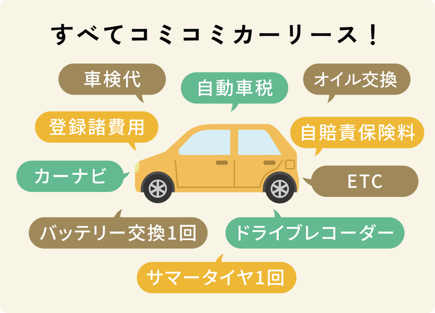 登録時の諸費用やご契約期間中の車検基本料や税金などの維持費まで、もろもろコミコミで月々一定のお支払いでご利用いただけます。