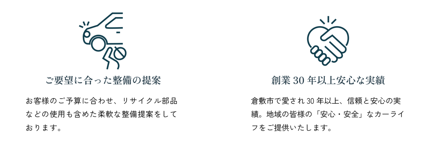 代車を無料で手配いたします。また、車検後の2年間保証を付帯いたします。(最大30万円まで)
