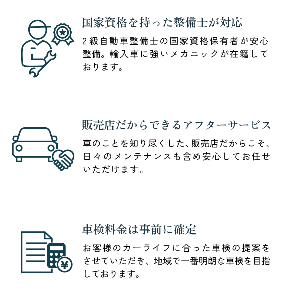 経験豊富な整備士が一台一台を丁寧に整備しています。基本点検はもちろんのこと、お客様の安全と快適さを第一に考えた細やかな対応が自慢です。